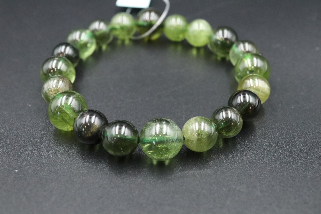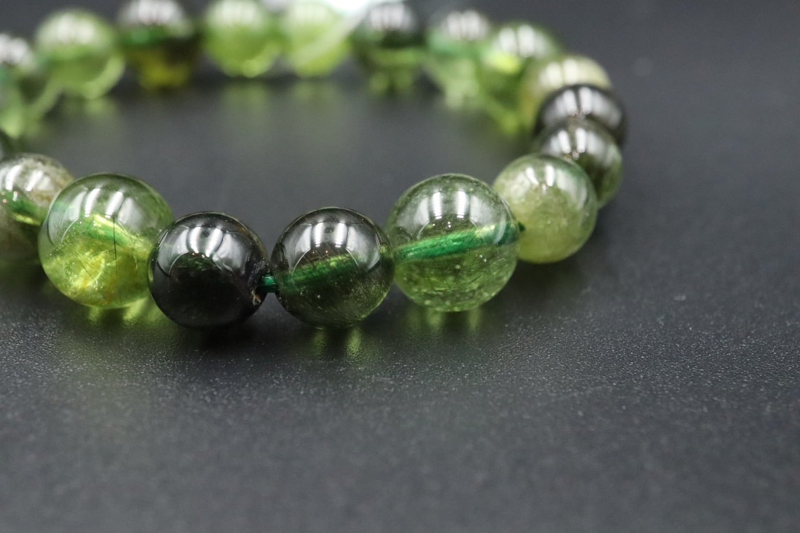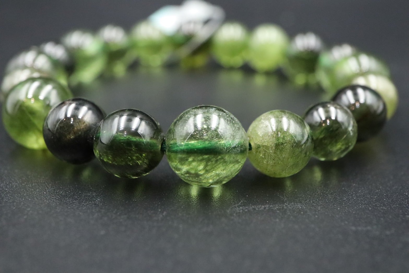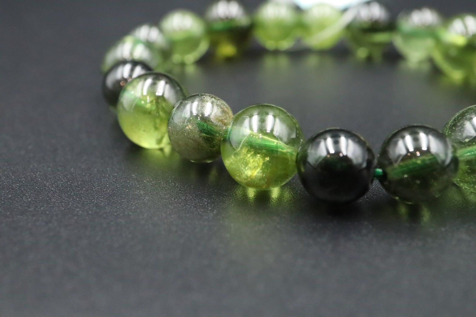 結晶に内包し爽やかなペリドットのグリーンを深く落ち着かせる繊細な針状鉱物は、世界的にも産出の限られる硼酸塩鉱物「ルドウィジャイト(和名:ルドウィヒ石)」です。