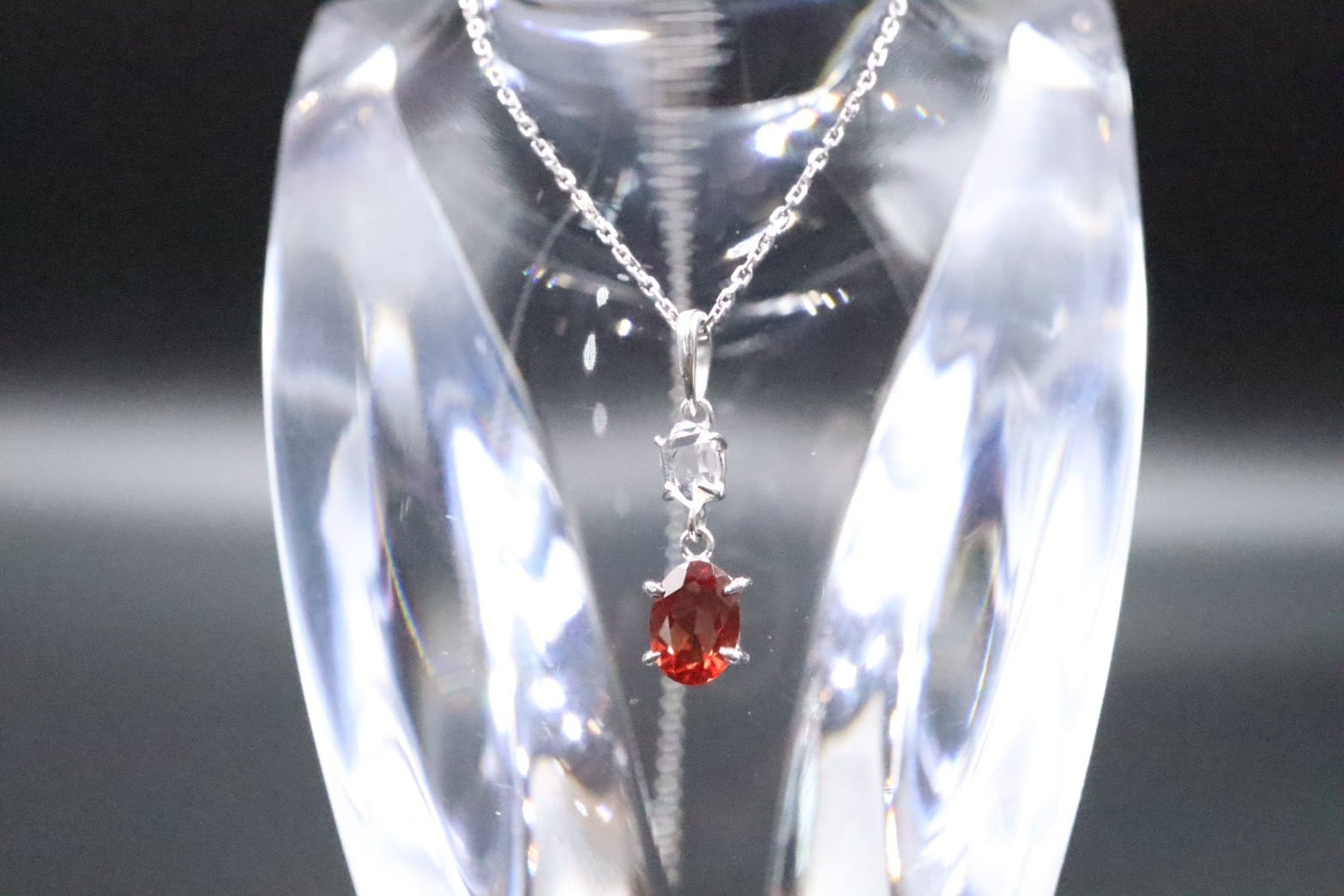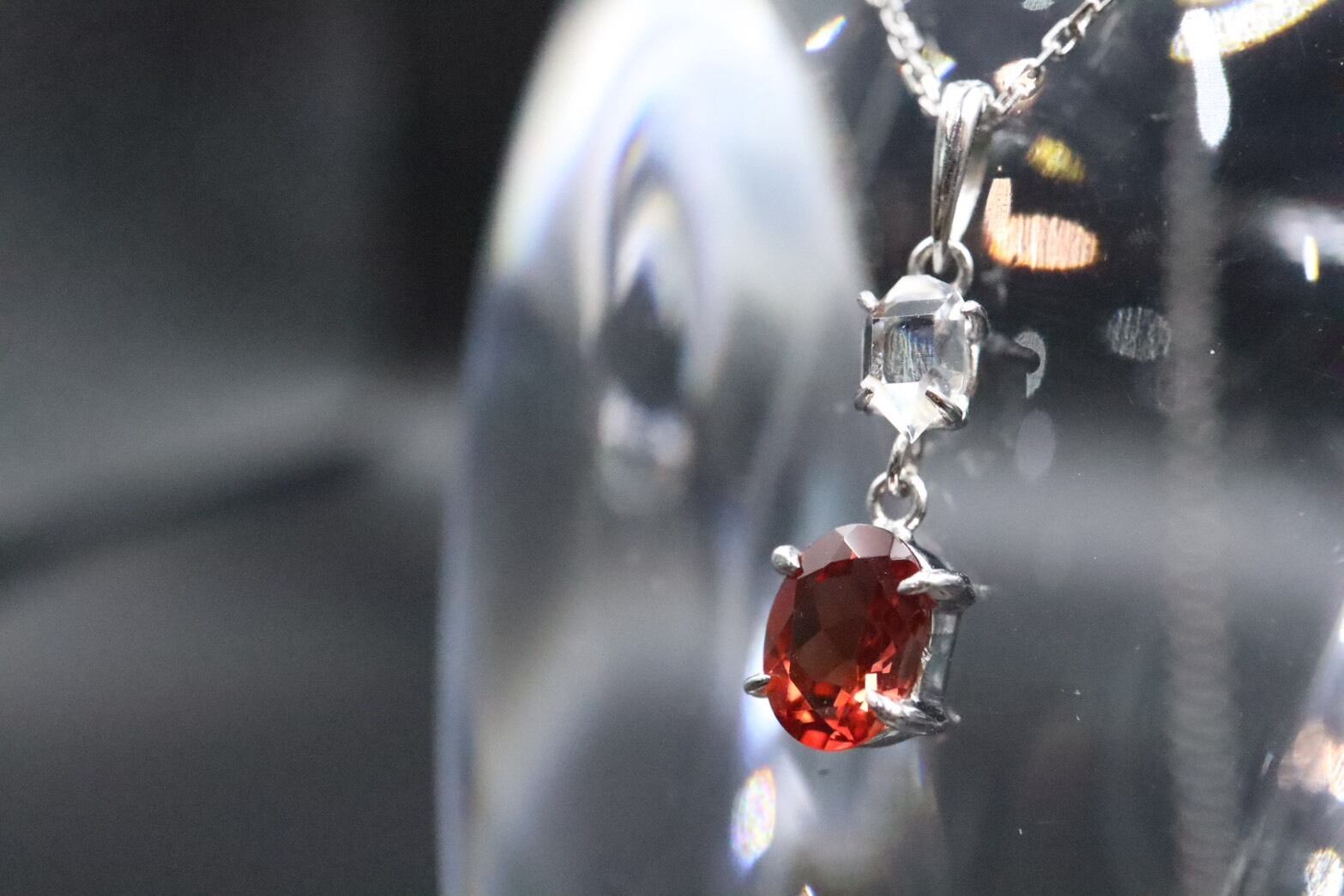 上質なプラチナに、天空の光を宿すハーキマーダイヤモンドと、魂の奥に潜む本心を映し出すアンデシンを縦に結んだ、インナーマインドシリーズの象徴的なペンダントトップです。