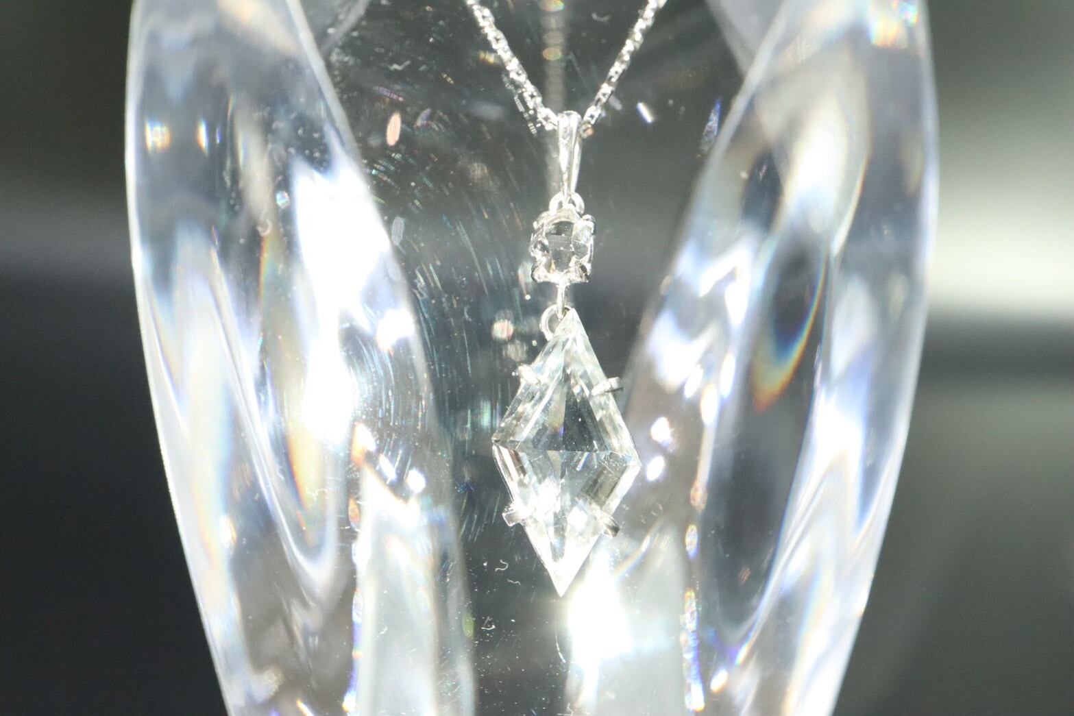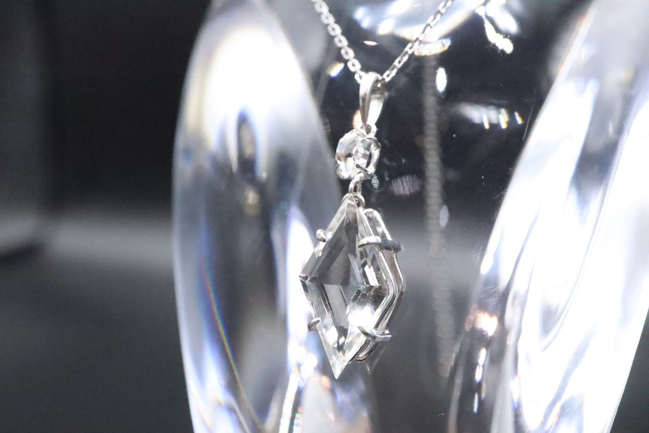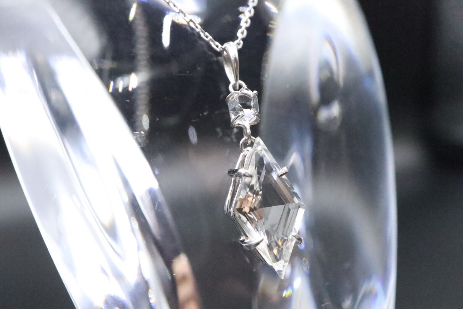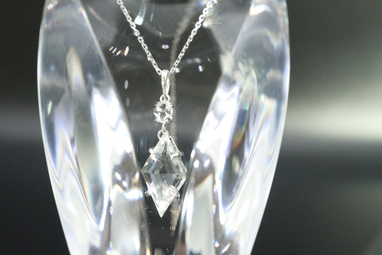 2つの石をプラチナで縦に結んだこのペンダントは、内面をクリアな状態へ導き、あなたの意識をより高いステージへと引き上げる特別なジュエリーです。