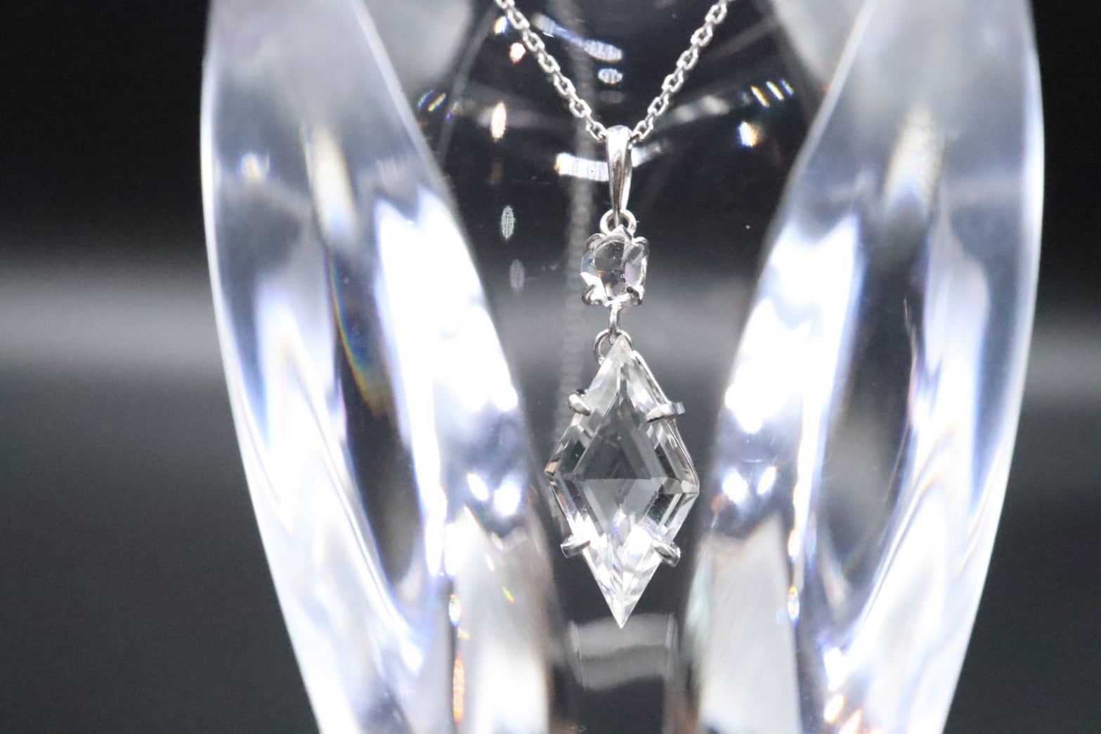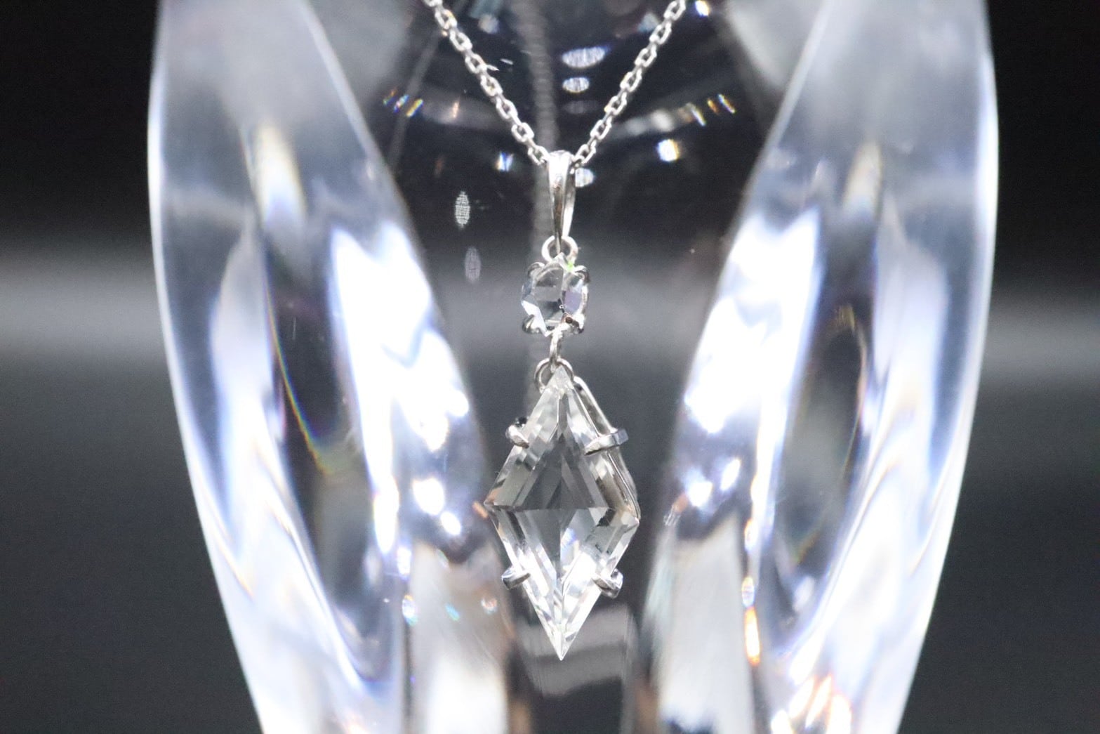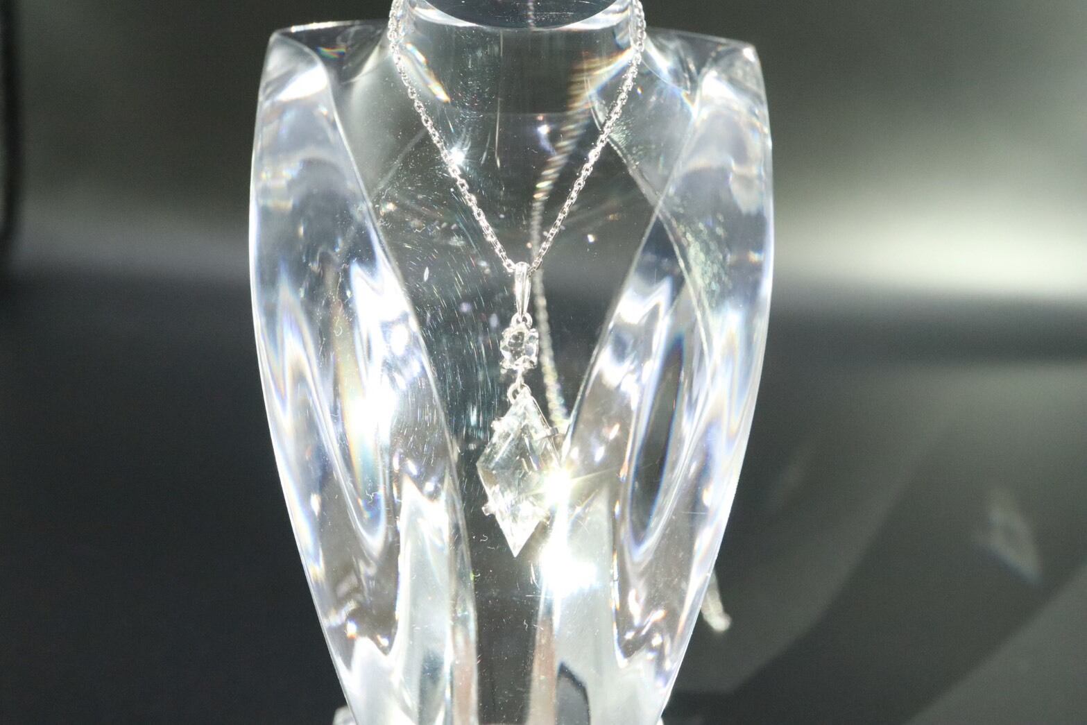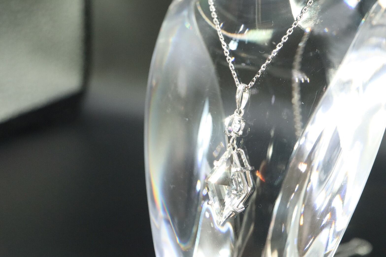 2つの石をプラチナで縦に結んだこのペンダントは、内面をクリアな状態へ導き、あなたの意識をより高いステージへと引き上げる特別なジュエリーです。